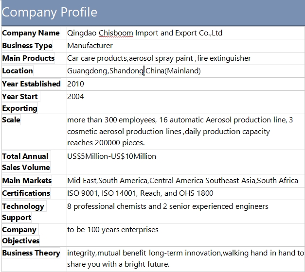 Chisboom, Golden Aerosol Paint'in profesyonel bir üreticisi ve tedarikçisidir. Kuruluşundan bu yana, iç ve dış pazarlardaki müşteriler tarafından derinden sevilmiştir. Bir tedarikçi olarak, altın aerosol boyasının dayanıklılığı ve pratikliği sağlanmalıdır. Chisboom'un profesyonel bir ekibine ve pazar değişikliklerine yanıt vermek ve sürekli inovasyon elde etmek için eksiksiz tesisleri vardır.